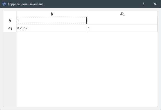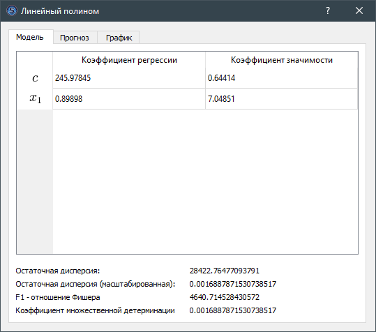 На странице Модель любого окна из Моделирование можно увидеть данные Коэффициент регрессии и Коэффициент значимости в виде таблицы для отклика и каждого из факторов. В нижней части окна располагаются вычисленные значения для параметров: Остаточная дисперсия, Остаточная дисперсия (масштабированная), F1 - отношение Фишера, Коэффициент множественной детерминации,