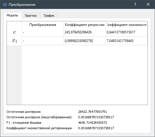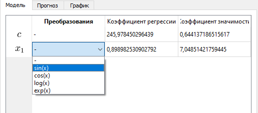 При необходимости, в окне Моделирование - Преобразования для каждого фактора вы можете выбрать одно из доступных преобразований.