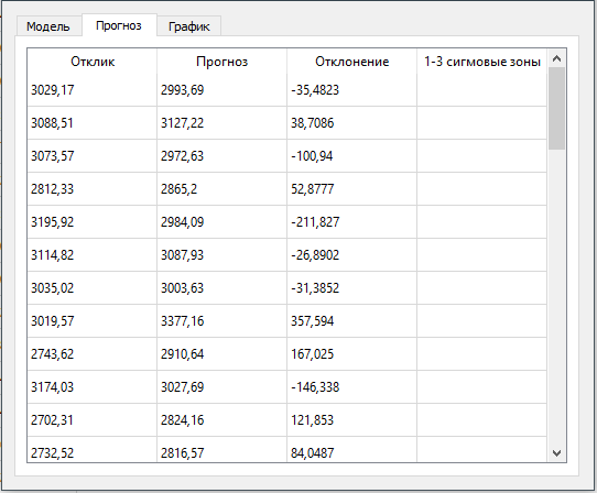 На странице Прогноз любого окна из Моделирование можно увидеть значения Прогноза и Отклонения для каждого ранее сгенерированного значения Отклика.